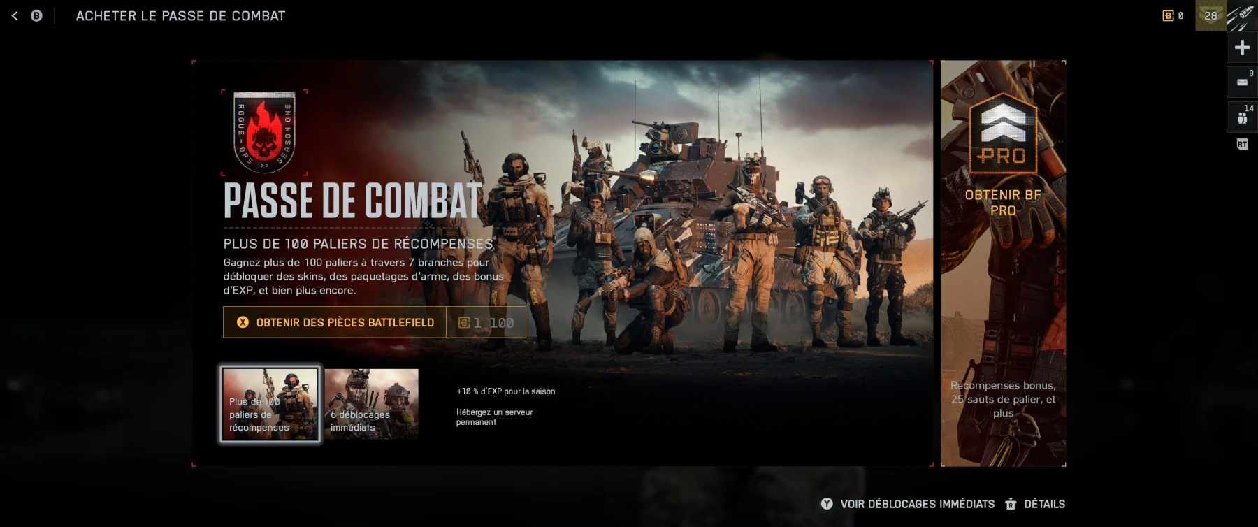 Côté boutique, un pack premium est mis en avant au prix de 24.99€ nommé Battlefield PRO, incluant l'accès complet, 25 sauts de palier immédiats et un bonus d'EXP. La vraie nouveauté reste l'abandon de la progression linéaire au profit d'un système de branches à débloquer.